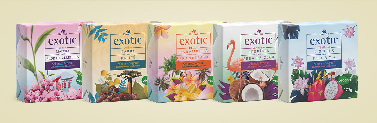 Imagens dos cartuchos da linha de sabonetes Exotic, desenvoldidas totalmente em 3d, para a Davene.