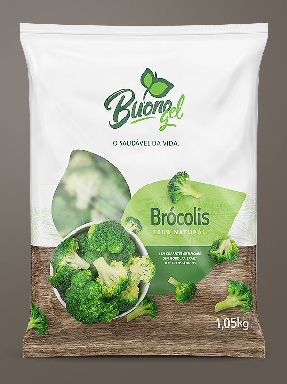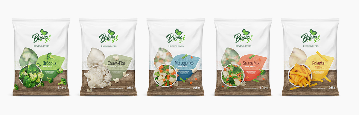 Imagens de embalagens tipo saco, da linha de congelados, desenvoldidas em 3d e fotografia, para a Buonogel.
